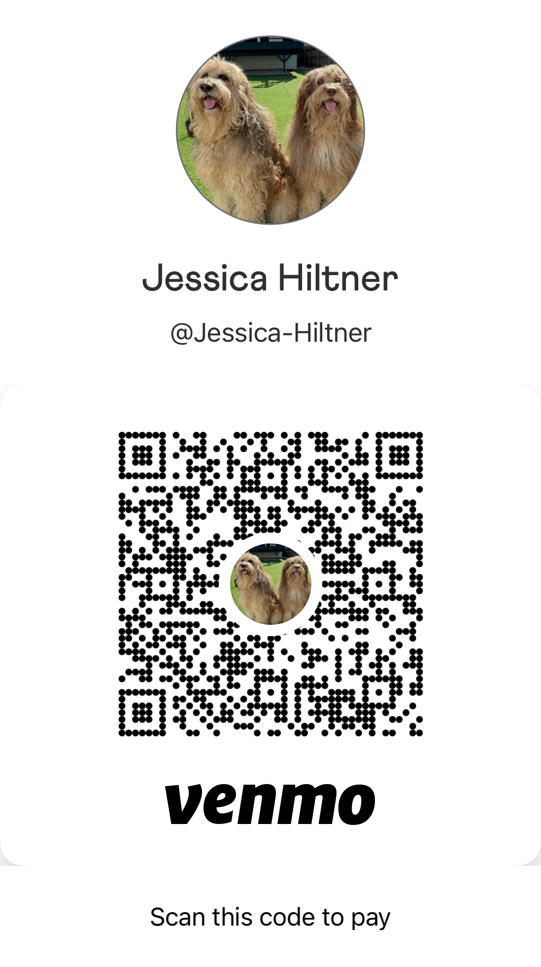 Payments are due by the end of care, before pick up. We have Zelle and Venmo (QR codes below); Good ole cash/check are accepted; or we can send an invoice for you to pay by credit card (with additional processing fees).